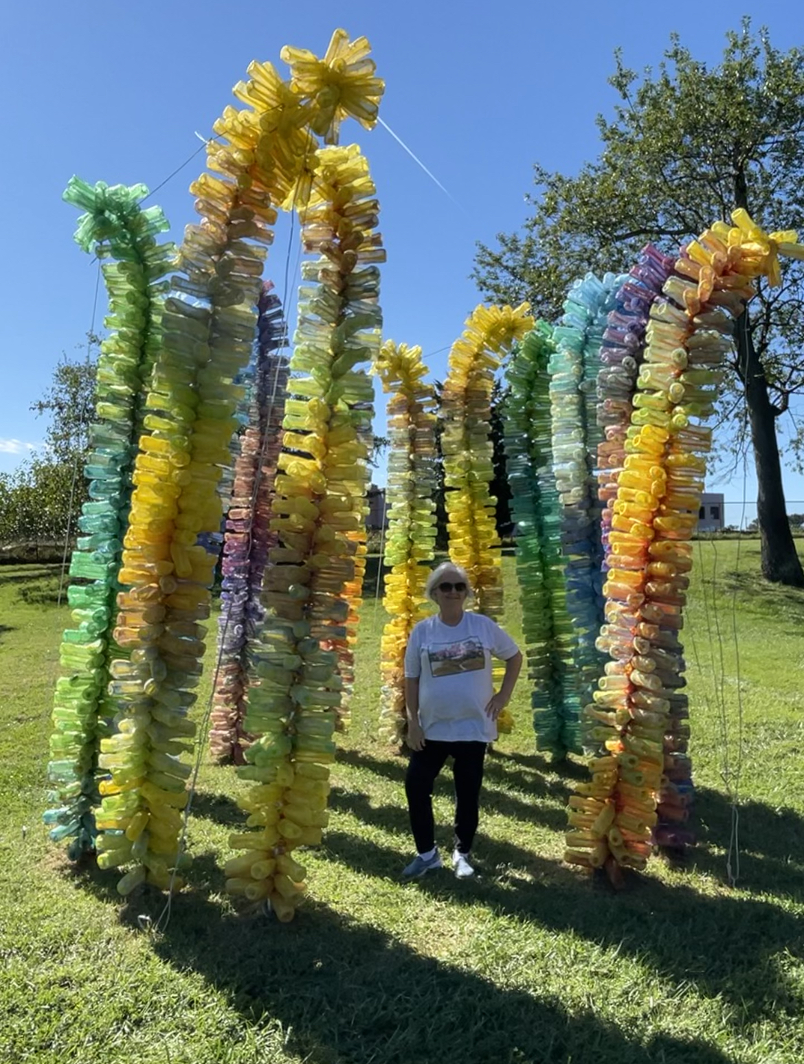 We woke up to 55ยบ weather but by the time we left, it had warmed up to 70. We headed to the farmer's market in Lewes at George WP Smith Park. It was small but lots of good veggies and a few other items. We bought 2 cookies and I got 2 lavender items. We walked around the pond there and saw an interesting art installation made of plastic bottles and colored plastic netting.